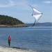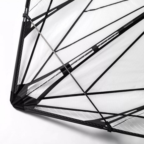 Ensuite c’est la voile en elle-même qui provoque l’étonnement. Tout ici est totalement épuré ! La couleur blanche couplée à du mylar transparent donnent immédiatement un ressenti de légèreté, mêlé à la curiosité de découvrir si cette apparence qui est aussi très structurée ne cacherait pas d’autres possibilité.